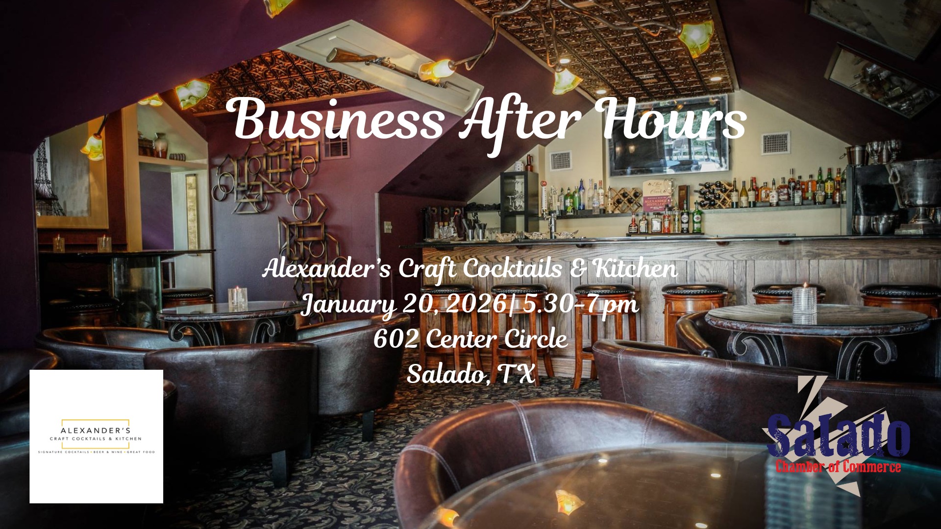 Join us for the first Business After Hours of the new year on January 20, 2026, at 5:30 p.m., hosted by Alexander's Craft Cocktails and Kitchen. Located at 602 Center Circle in Salado, Alexander’s offers the perfect setting to kick off the year with great conversation, new connections, and a welcoming atmosphere. Start the new year off right—come network with wonderful people and enjoy an evening at Alexander’s. We look forward to seeing you there!