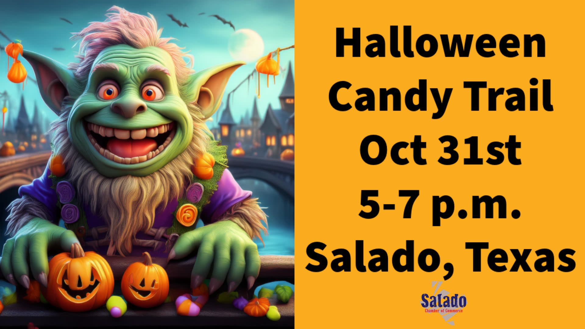 No tricks, just treats! This Halloween (Oct 31st) come to Salado, Texas to trick or treat with the Chamber and a selection of downtown small businesses. We will be giving candy out 5-7 p.m. Be on the lookout for the bridge troll! Check out the businesses below that are participating on the Candy Trial this year. There will be more to come! If you are a business and would like to be on this list, email us at chamber@salado.com! Provecho 21 Main CentraLand and Title Nancy Best, Christy’s Woof Salado The Local Vine Tex28 Outfitters Tablerock Empressario VFW Post 12235 Salado Eagle Storage Shoppes on Main Bar 1859 Salado Biblical Solutions Salado General Store SophitiKatz Salado Spice and Tea The Shed Salado Chamber of CommerceImages